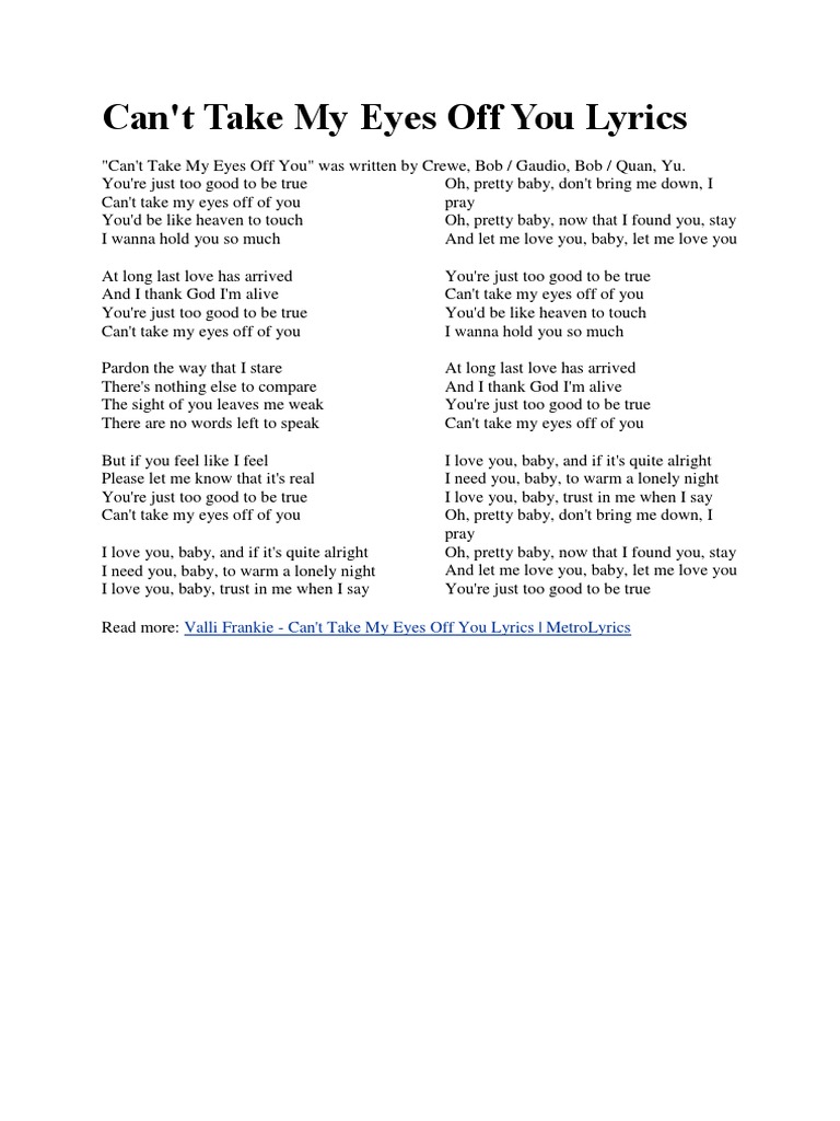 Can T Take My Eyes Off Of You Lyrics, Can T Take My Eyes Off You Frankie Valli Great Song Lyrics Lyrics To Live By Music Quotes Lyrics, There's nothing else to compare.. C and i thank god c7 the sight of you makes me weak. verse 1 you're just too good to be true can't take my eyes off of you you'd be like heaven to touch i wanna hold you so much at long last love has verse 2 pardon the way that i stare there's nothing else to compare the sight of you leaves me weak there are no words left to speak but if you feel like. The lyrics to the four season's song is off of you, however it is more correct to say off you. off of is an unnecessary use of two prepositions. I love you baby and if it's quite alright i need you baby to warm the lonely night i love you baby, trust in me when i say oh pretty baby. More crucial star lyrics at klyrics.net.